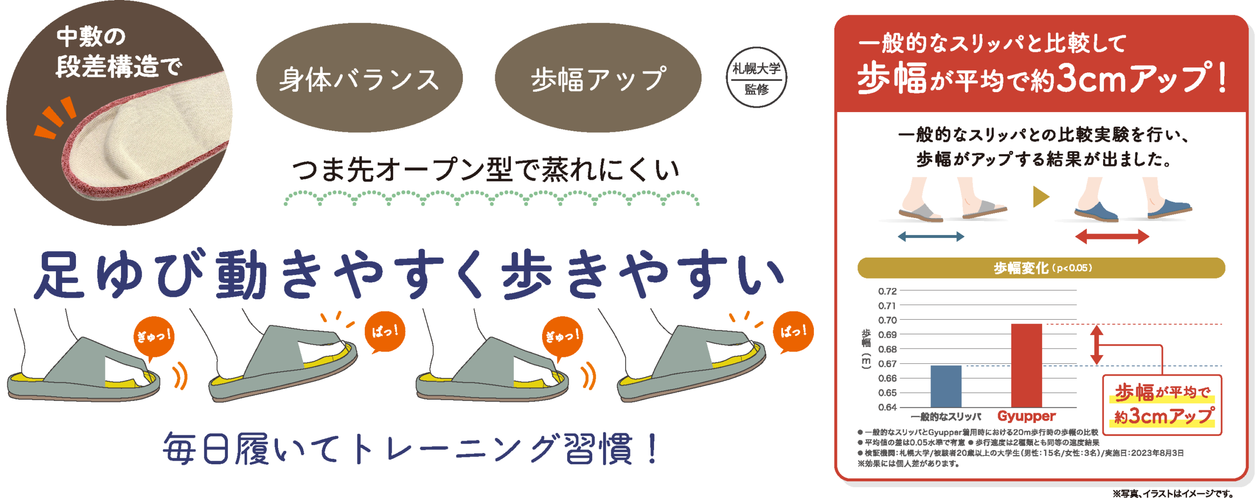 足ゆびの動きを考えた設計で、歩きやすさをサポートする前あきスリッパです。
