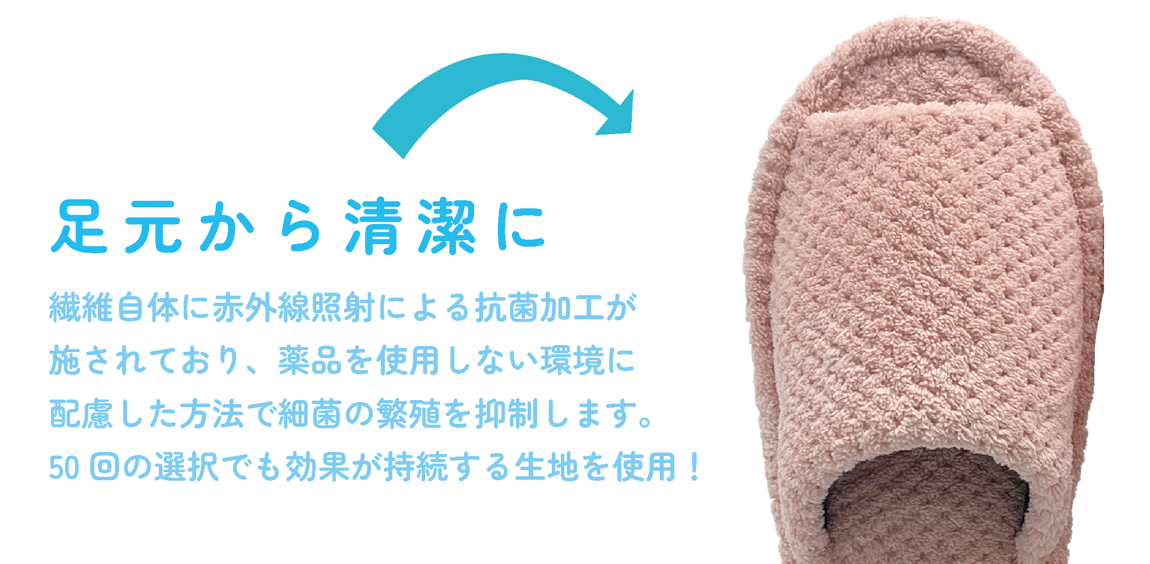ふんわりとしたサンゴボア素材に、赤外線照射による抗菌加工を施しました。